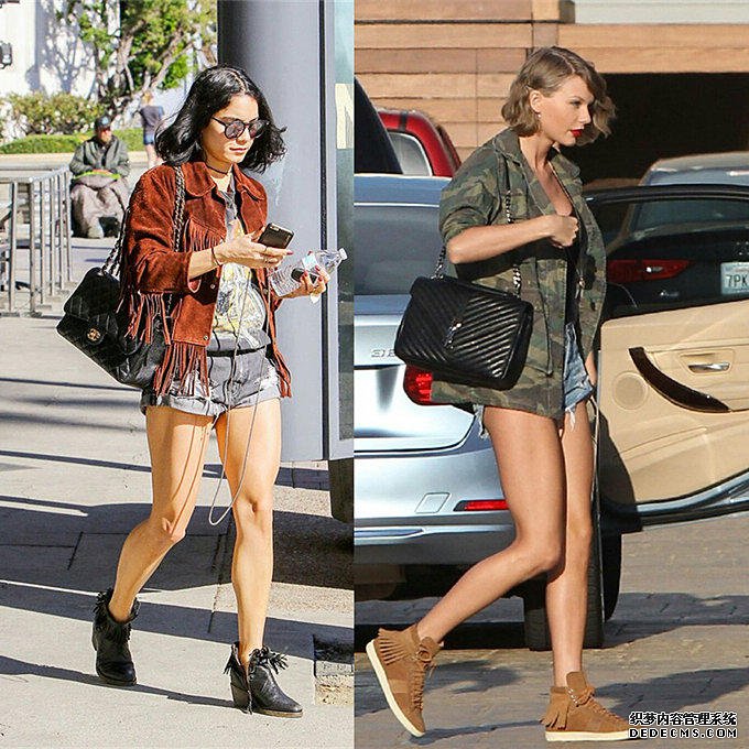 说起来两个人的穿搭元素还真得高度相似,都是突出大长腿的穿搭,凡妮莎肌肉感很强的大腿有点拉低分数,倒是身材顺溜的泰勒斯威芙特略胜一筹,只是泰勒选的这个包包其实还可以换个更青春洋溢点的。